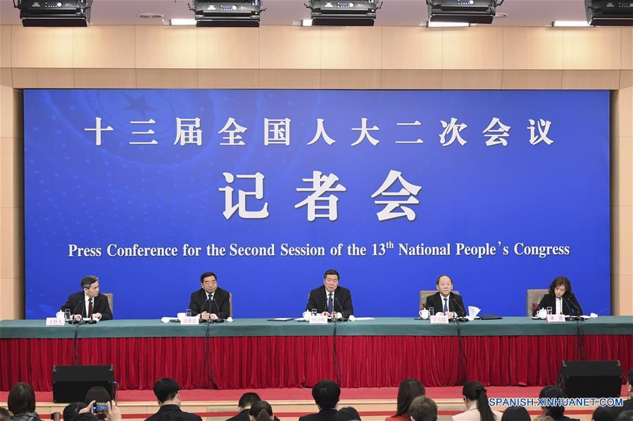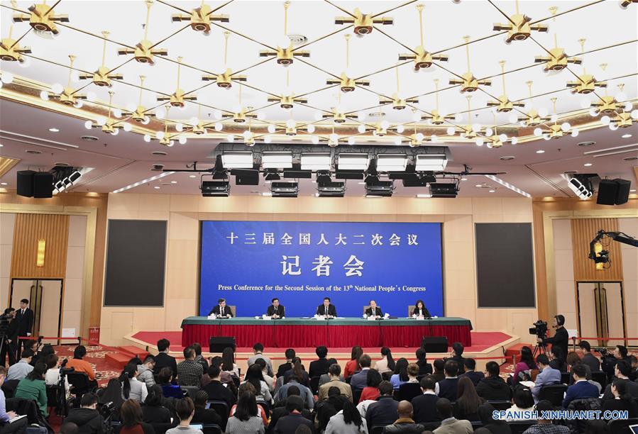 BEIJING, 6 marzo, 2019 (Xinhua) -- He Lifeng (c), director de la Comisión Nacional de Desarrollo y Reforma, Ning Jizhe (2-d) y Lian Weiliang (2-i), subdirectores de la comisión, participan en una conferencia de prensa sobre el impulso del desarrollo de alta calidad de la economía china en el marco de la segunda sesión de la XIII Asamblea Popular Nacional en Beijing, capital de China, el 6 de marzo de 2019.(Xinhua/Zhai Jianlan)