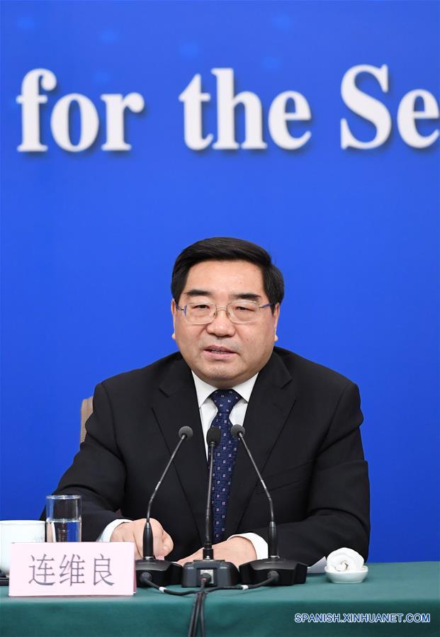 Lian Weiliang, subdirector de la Comisión Nacional de Desarrollo y Reforma, responde preguntas durante una conferencia de prensa sobre el impulso del desarrollo de alta calidad de la economía china en el marco de la segunda sesión de la XIII Asamblea Popular Nacional en Beijing, capital de China, el 6 de marzo de 2019.(Xinhua/Zhai Jianlan)