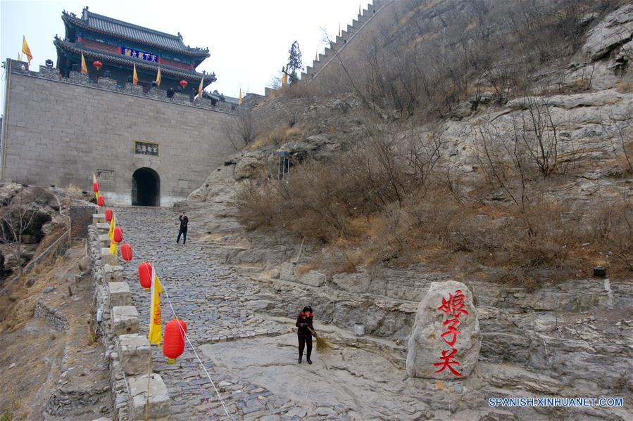 SHANXI, 7 marzo, 2019 (Xinhua) -- Imagen del 26 de febrero de 2019 tomada con un dron de la residente Duan Guiying (frente) barriendo el camino en el punto escénico de la villa de Niangziguan de la localidad de Niangziguan, en el condado de Pingding, provincia de Shanxi, en el norte de China. Las mujeres de la localidad de Niangziguan han jugado un papel vital en el desarrollo de la industria del turismo local bajo una campa?a de alivio de la pobreza. Teniendo en cuenta la experiencia del turismo, ellas han hecho planes para mejorar los factores de servicio claves tales como rutas, abastecimiento y alojamiento. A su vez, el número de turistas ha aumentado. Todos los residentes de la localidad de Niangziguan han sido ayudados a salir de la pobreza a finales de 2018. (Xinhua/Cao Yang)