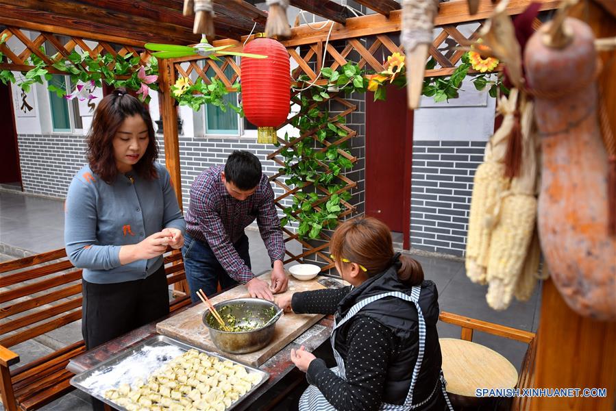 SHANXI, 7 marzo, 2019 (Xinhua) -- Imagen del 26 de febrero de 2019 de Duan Suhua (i), quien maneja un hostal, elaborando bolas de masa hervida para turistas en su casa de campo, en la villa de Niangziguan de la localidad de Niangziguan, en el condado de Pingding, provincia de Shanxi, en el norte de China. Las mujeres de la localidad de Niangziguan han jugado un papel vital en el desarrollo de la industria del turismo local bajo una campa?a de alivio de la pobreza. Teniendo en cuenta la experiencia del turismo, ellas han hecho planes para mejorar los factores de servicio claves tales como rutas, abastecimiento y alojamiento. A su vez, el número de turistas ha aumentado. Todos los residentes de la localidad de Niangziguan han sido ayudados a salir de la pobreza a finales de 2018. (Xinhua/Cao Yang)