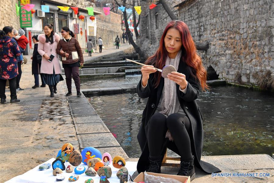 SHANXI, 7 marzo, 2019 (Xinhua) -- Imagen del 27 de febrero de 2019 de la residente Duan Jiying elaborando souvenirs, en la villa de Niangziguan de la localidad de Niangziguan, en el condado de Pingding, provincia de Shanxi, en el norte de China. Las mujeres de la localidad de Niangziguan han jugado un papel vital en el desarrollo de la industria del turismo local bajo una campa?a de alivio de la pobreza. Teniendo en cuenta la experiencia del turismo, ellas han hecho planes para mejorar los factores de servicio claves tales como rutas, abastecimiento y alojamiento. A su vez, el número de turistas ha aumentado. Todos los residentes de la localidad de Niangziguan han sido ayudados a salir de la pobreza a finales de 2018. (Xinhua/Cao Yang)