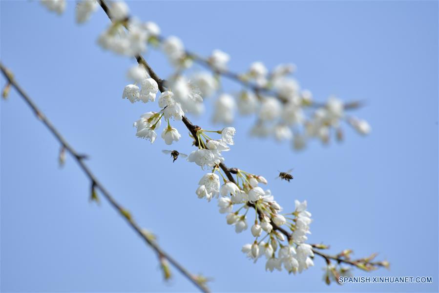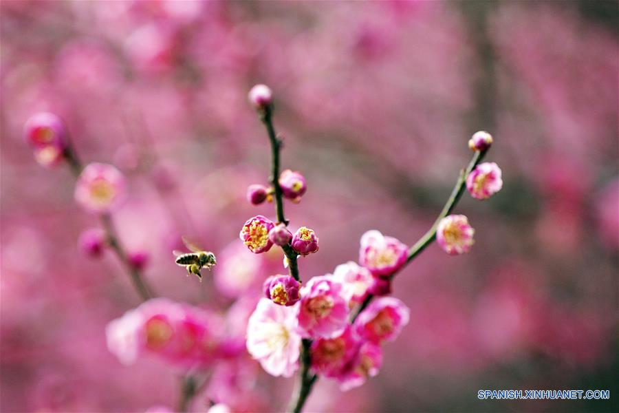 HUBEI, 7 marzo, 2019 (Xinhua) -- Imagen del 6 de marzo de 2019 de una abeja volando entre flores, en el condado de Zigui, provincia de Hubei, en el centro de China. Este miércoles marcó el día de "Jingzhe", que significa literalmente el despertar de los insectos, que es el tercero de los 24 términos solares en el Calendario Lunar Chino. El aumento de la temperatura hace que la naturaleza esté llena de vigor y vitalidad. (Xinhua/Wang Gang)