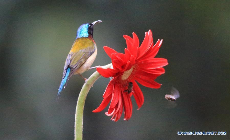 HUNAN, 7 marzo, 2019 (Xinhua) -- Imagen del 6 de marzo de 2019 de un pájaro posándose sobre una flor, en la villa de Wuxing en el distrito de Yanfeng de la ciudad de Hengyang, provincia de Hunan, en el centro de China. Este miércoles marcó el día de "Jingzhe", que significa literalmente el despertar de los insectos, que es el tercero de los 24 términos solares en el Calendario Lunar Chino. El aumento de la temperatura hace que la naturaleza esté llena de vigor y vitalidad. (Xinhua/Cao Zhengping)