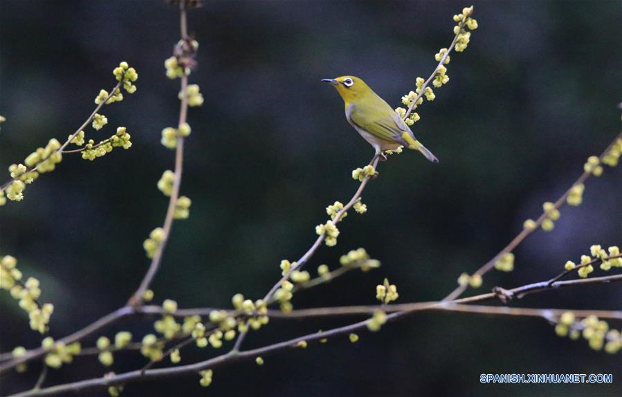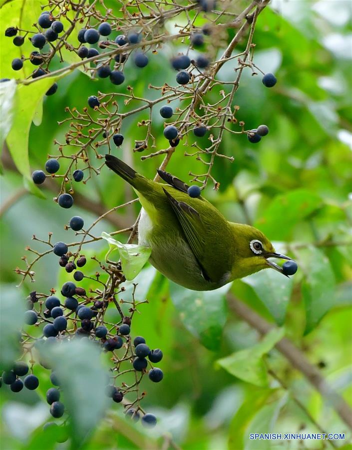 FUJIAN, 7 marzo, 2019 (Xinhua) -- Imagen del 6 de marzo de 2019 de un ojiblanco alimentándose de bayas sobre un árbol, en Fuzhou, provincia de Fujian, en el sureste de China. Este miércoles marcó el día de "Jingzhe", que significa literalmente el despertar de los insectos, que es el tercero de los 24 términos solares en el Calendario Lunar Chino. El aumento de la temperatura hace que la naturaleza esté llena de vigor y vitalidad. (Xinhua/Wei Peiquan)