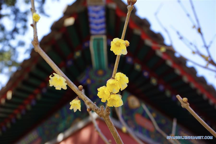 BEIJING, 7 marzo, 2019 (Xinhua) -- Vista de flores en el Templo Wofo en el Jardín Botánico de Beijing, en el distrito de Haidian de Beijing, capital de China, el 7 de marzo de 2019. Algunas flores han entrado en temporada de floración mientras la temperatura aumenta a principios de primavera en Beijing. (Xinhua/Cui Bowen)