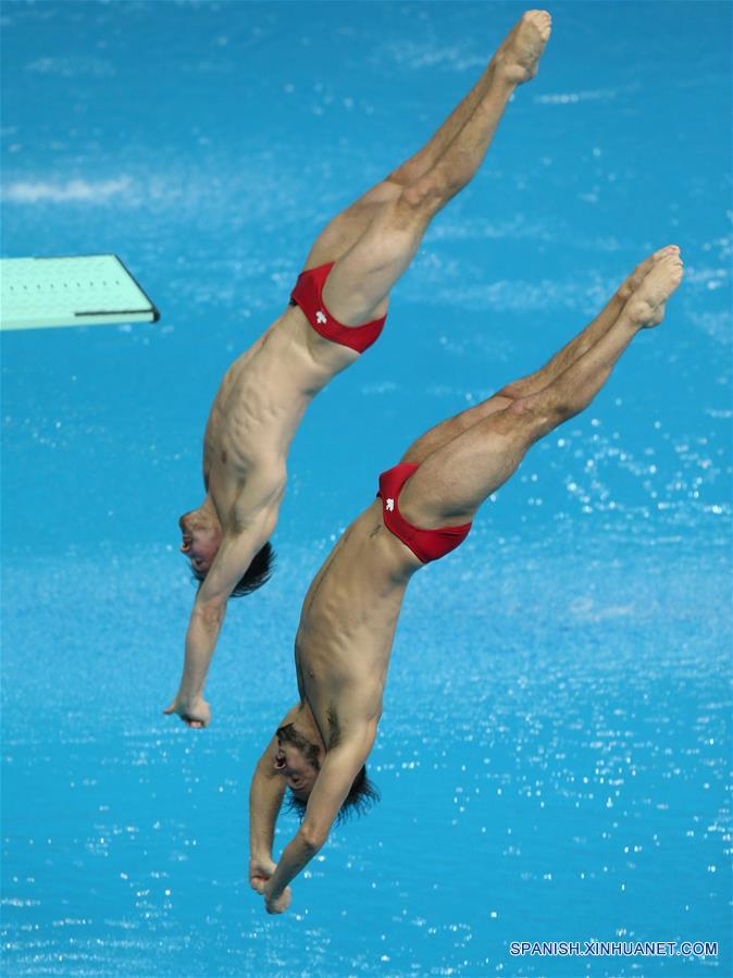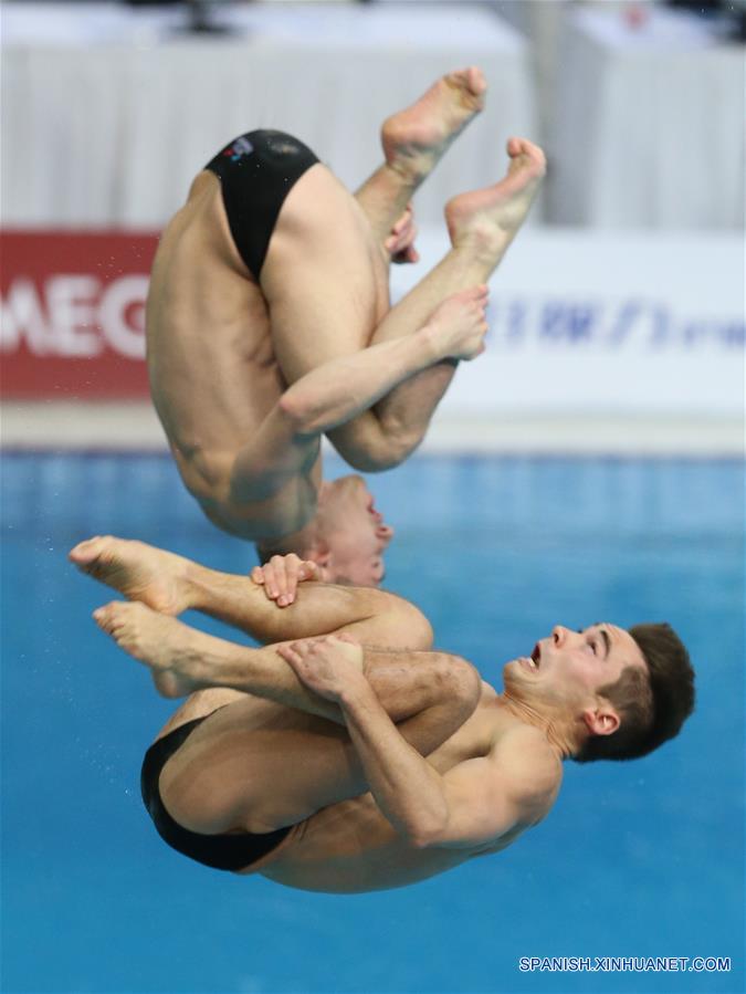 BEIJING, 7 marzo, 2019 (Xinhua) -- Jack Laugher (arriba) y Daniel Goodfellow (abajo), de Reino Unido, compiten durante la Final de Trampolín de 3 metros Sincronizado masculino de la Serie Mundial de Clavados 2019 de la Federación Internacional de Natación (FINA) en el Centro Acuático Nacional en Beijing, capital de China, el 7 de marzo de 2019. (Xinhua/Xu Zijian)