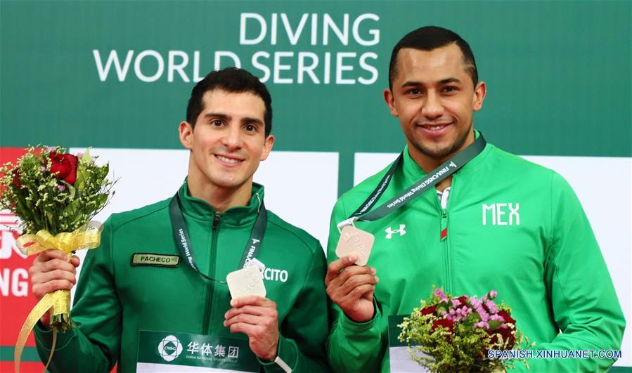 BEIJING, 7 marzo, 2019 (Xinhua) -- Los medallistas de plata Jahir Ocampo Marroquín (d) y Rommel Pacheco Marrufo (i), de México, posan durante la ceremonia de premiación de la Final de Trampolín de 3 metros Sincronizado masculino de la Serie Mundial de Clavados 2019 de la Federación Internacional de Natación (FINA) en el Centro Acuático Nacional en Beijing, capital de China, el 7 de marzo de 2019. (Xinhua/Luo Yuan)