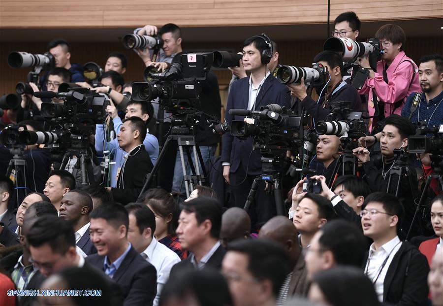 Periodistas trabajan en una conferencia de prensa sobre la política exterior de China en el marco de la segunda sesión de la XIII Asamblea Popular Nacional en Beijing, capital de China, el 8 de marzo de 2019. (Xinhua/Wang Peng)