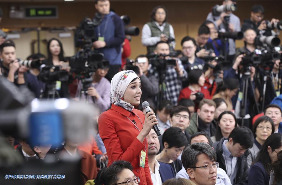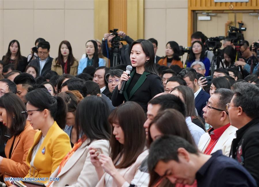 Una periodista formula una pregunta en una conferencia de prensa sobre la política exterior de China en el marco de la segunda sesión de la XIII Asamblea Popular Nacional en Beijing, capital de China, el 8 de marzo de 2019. (Xinhua/Yin Gang)