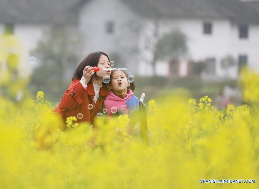 HUNAN, 10 marzo, 2019 (Xinhua) -- Ni?os soplan burbujas en medio de flores de col en la villa de Liaojiang de la municipalidad de Liaojiang en Zixing, en la provincia de Hunan, en el centro de China, el 10 de marzo de 2019. El brote de las flores indica la llegada de la primavera. (Xinhua/Zhu Xiaorong)
