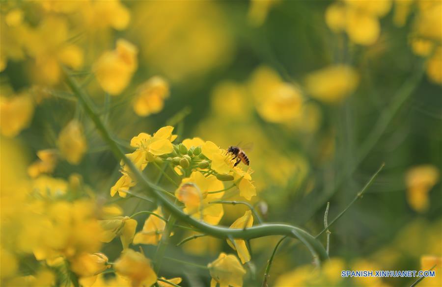 LIUZHOU, 10 marzo, 2019 (Xinhua) -- Imagen del 9 de marzo de 2019, de una abeja volando sobre flores en la villa Dongqi del condado de Rong'an en Liuzhou, en la Región Autónoma Zhuang de Guangxi. El brote de las flores indica la llegada de la primavera. (Xinhua/Tan Kaixing)