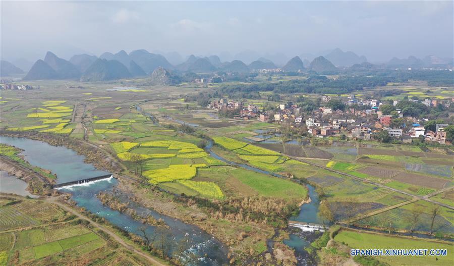 HUNAN, 10 marzo, 2019 (Xinhua) -- Turistas caminan en medio de flores de col en la orilla del Río Xiaoshui, en el condado de Daoxian, en la provincia de Hunan, en el centro de China, el 10 de marzo de 2019. El brote de las flores indica la llegada de la primavera. (Xinhua/He Hongfu)