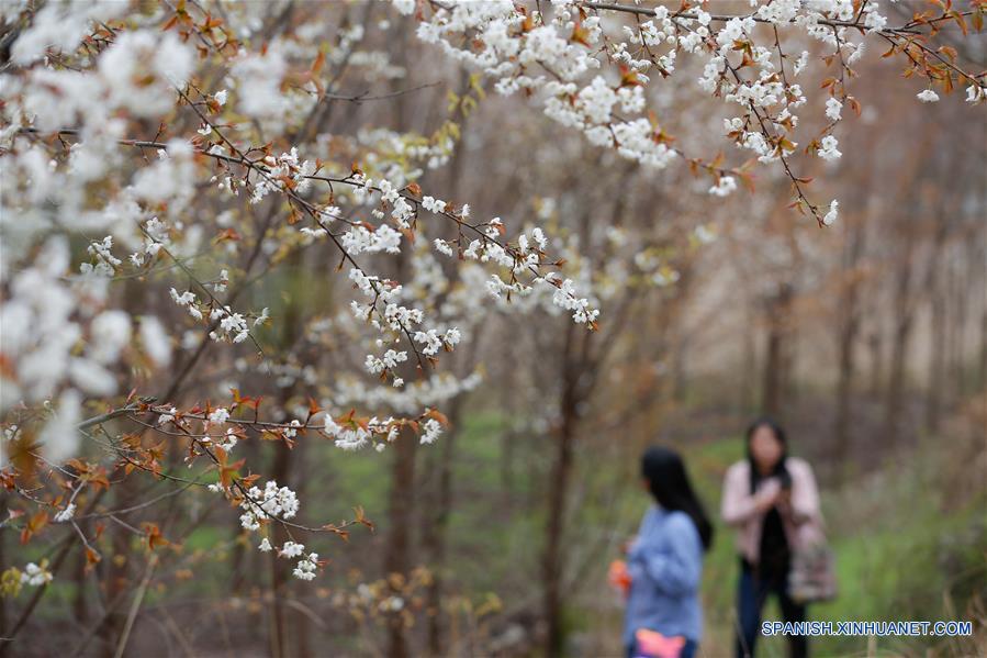 BIJIE, 10 marzo, 2019 (Xinhua) -- Turistas observan flores en la villa de Pingyuan de la municipalidad de Shuangshan en Bijie, en la provincia de Guizhou, en el suroeste de China, el 10 de marzo de 2019. El brote de las flores indica la llegada de la primavera. (Xinhua/Luo Dafu)