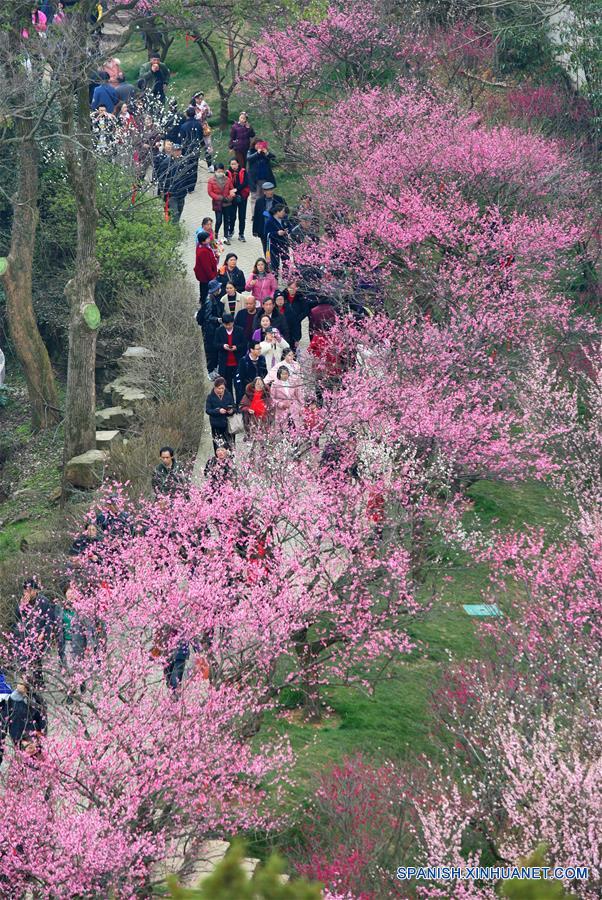 WUXI, 10 marzo, 2019 (Xinhua) -- Turistas observan flores de ciruelo en el Jardín Meiyuan en Wuxi, en la provincia de Jiangsu, en el este de China, el 10 de marzo de 2019. El brote de las flores indica la llegada de la primavera. (Xinhua/Chen Wei)