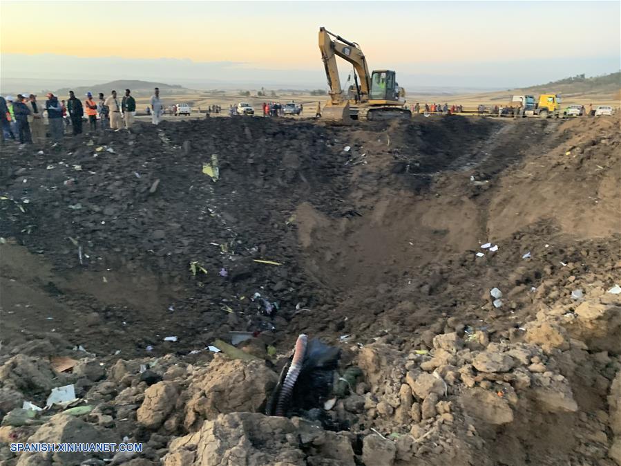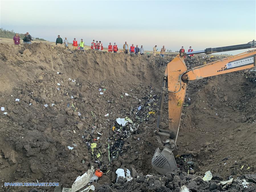 Una excavadora trabaja en el sitio de accidente de un avión de Ethiopian Airlines (ET) que se estrelló cerca de la ciudad de Bishoftu, a unos 45km al sureste de Addis Abeba, Etiopía, el 10 de marzo de 2019. Ethiopian Airlines confirmó la muerte de las 157 personas a bordo del vuelo con destino a Nairobi, Kenia, que se estrelló la ma?ana del domingo. Las 157 personas a bordo del ET 302 incluían a ciudadanos de más de 30 países, confirmó en conferencia de prensa el director general de Ethiopian Airlines Group, Tewolde Gebremariam. (Xinhua/Wang Shoubao)