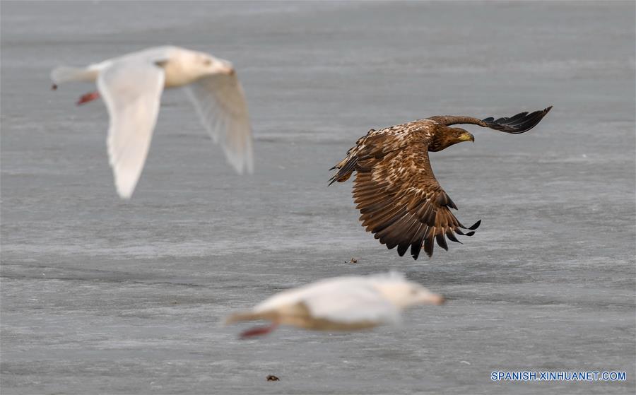 JILIN, 11 marzo, 2019 (Xinhua) -- Un águila de cola blanca y dos gaviotas vuelan sobre el Humedal de Jingxin, en la provincia de Jilin, en el noreste de China, el 11 de marzo de 2019. El Humedal de Jingxin se convierte en un hogar temporal para varias aves migratorias, al inicio de la primavera en marzo. (Xinhua/Zhang Nan)