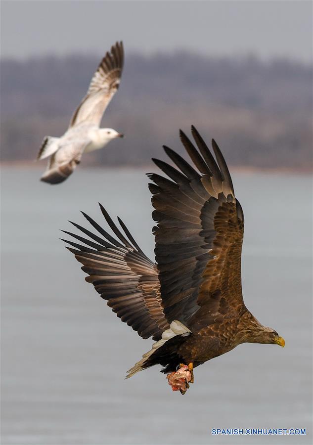 JILIN, 11 marzo, 2019 (Xinhua) -- Un águila de cola blanca y una gaviota vuelan sobre el Humedal de Jingxin, en la provincia de Jilin, en el noreste de China, el 11 de marzo de 2019. El Humedal de Jingxin se convierte en un hogar temporal para varias aves migratorias, al inicio de la primavera en marzo. (Xinhua/Zhang Nan)