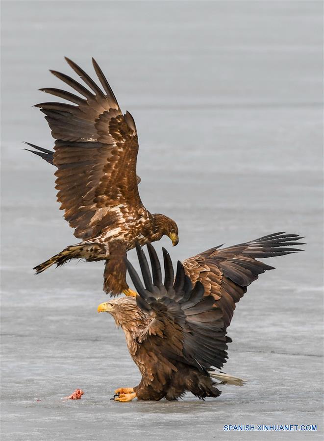 JILIN, 11 marzo, 2019 (Xinhua) -- Dos águilas de cola blanca atrapan comida sobre el Humedal de Jingxin, en la provincia de Jilin, en el noreste de China, el 11 de marzo de 2019. El Humedal de Jingxin se convierte en un hogar temporal para varias aves migratorias, al inicio de la primavera en marzo. (Xinhua/Zhang Nan)