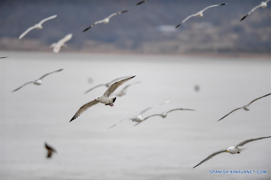 JILIN, 11 marzo, 2019 (Xinhua) -- Gaviotas vuelan sobre el Humedal de Jingxin, en la provincia de Jilin, en el noreste de China, el 11 de marzo de 2019. El Humedal de Jingxin se convierte en un hogar temporal para varias aves migratorias, al inicio de la primavera en marzo. (Xinhua/Zhang Nan)
