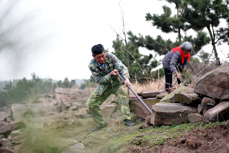 Liu Jichuan, de 65 a?os, es un veterano de la aldea Xiezizi en Honghua, condado Lucheng de Linyi, en la provincia de Shandong. En 2005, alquiló 1.100 acres de colinas áridas para su forestación a pesar de la oposición de su familia. Las áridas colinas con solo piedras rojas en el pasado ahora se han convertido en destinos turísticos con estaciones de hoja perenne, flores y frutas. La imagen muestra que el 10 de marzo de 2019, en la monta?a Maling del condado Lucheng de Linyi, en la provincia de Shandong, Liu Jichuan (izquierda) y su esposa estaban trabajan la tierra. Diario del Pueblo