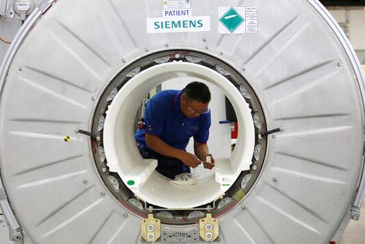 Un técnico trabaja en una línea de producción de Siemens Healthineers, en Shenzhen, provincia de Guangdong, el 25 de mayo de 2018.