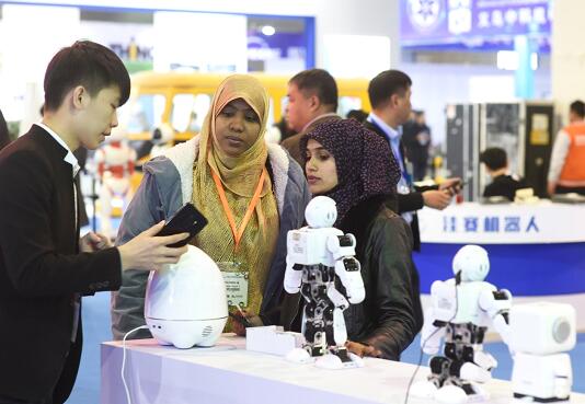 Un funcionario está presentando un robot a los visitantes extranjeros en una exposición en Yiwu en 2018. La exposición tuvo lugar el 29 de noviembre de 2018, atrayendo a un gran número de empresas de China, Estados Unidos, Alemania, Japón, Singapur e Italia.