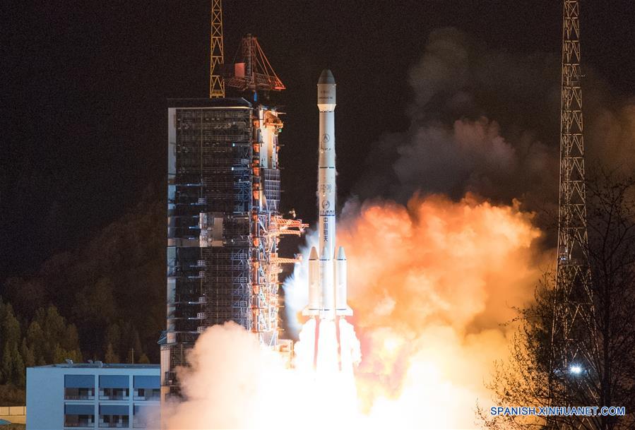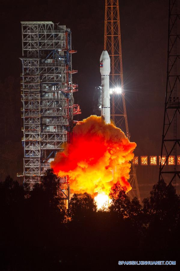SICHUAN, 11 marzo, 2019 (Xinhua) -- Imagen del 21 de noviembre de 2015 de un cohete transportando el satélite LaoSat-1, despegando del Centro de Lanzamiento Espacial de Xichang, en la provincia de Sichuan, en el suroeste de China. Un cohete Gran Marcha-3B puso en órbita el domingo un nuevo satélite de comunicación, misión con la que la serie de cohetes portadores Gran Marcha de China ha cumplido 300 lanzamientos, enviando 500 naves al espacio desde 1970. (Xinhua/Qing Haishi)