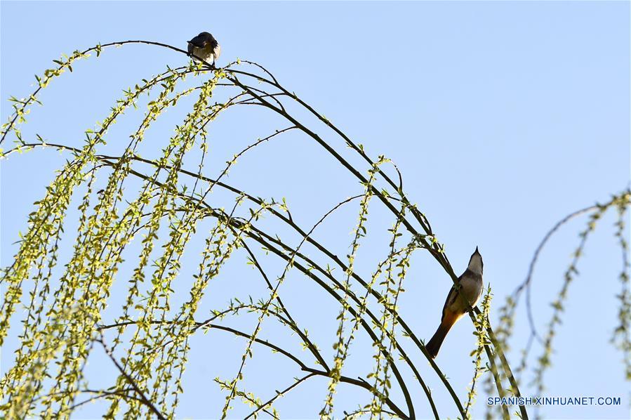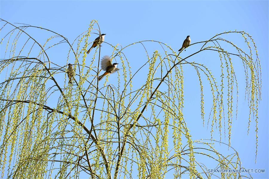HUBEI, 12 marzo, 2019 (Xinhua) -- Pájaros se posan sobre las ramas de un sauce en un parque, en el condado de Baokang en Xiangyang, provincia de Hubei, en el centro de China, el 12 de marzo de 2019. (Xinhua/Yang Tao)