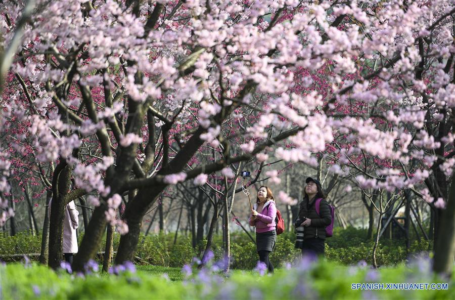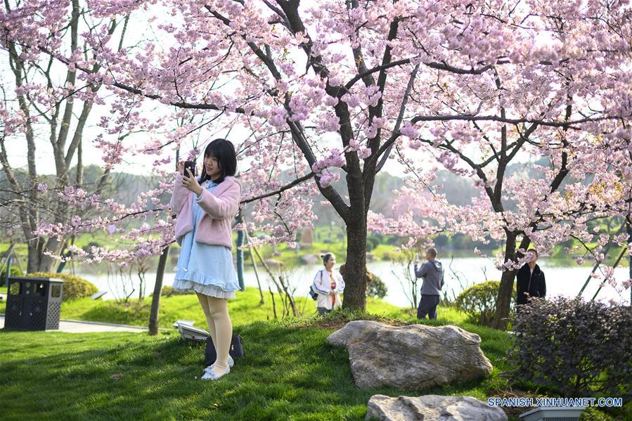 HUBEI, 13 marzo, 2019 (Xinhua) -- Una turista toma fotografías de las flores de cerezo por el Lago Oeste, en Wuhan, provincia de Hubei, en el centro de China, el 13 de marzo de 2019. (Xinhua/Xiong Qi)