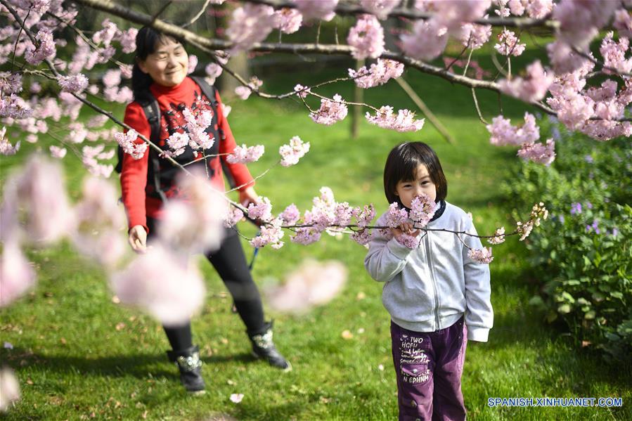 HUBEI, 13 marzo, 2019 (Xinhua) -- Turistas observan las flores de cerezo por el Lago Oeste, en Wuhan, provincia de Hubei, en el centro de China, el 13 de marzo de 2019. (Xinhua/Xiong Qi)