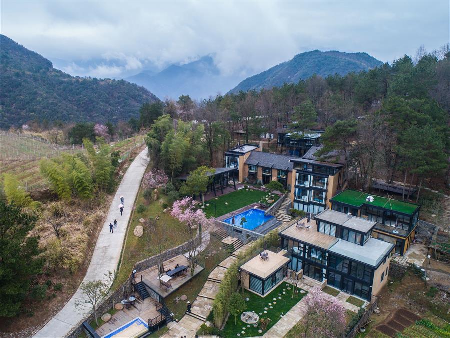 ZHEJIANG, 14 marzo, 2019 (Xinhua) -- Vista aérea de turistas observando el paisaje de primavera cerca de las casas de huéspedes, en la villa de Qianyuan del municipio de Sandu en Jiande, provincia de Zhejiang, en el este de China, el 14 de marzo de 2019. (Xinhua/Xu Yu)