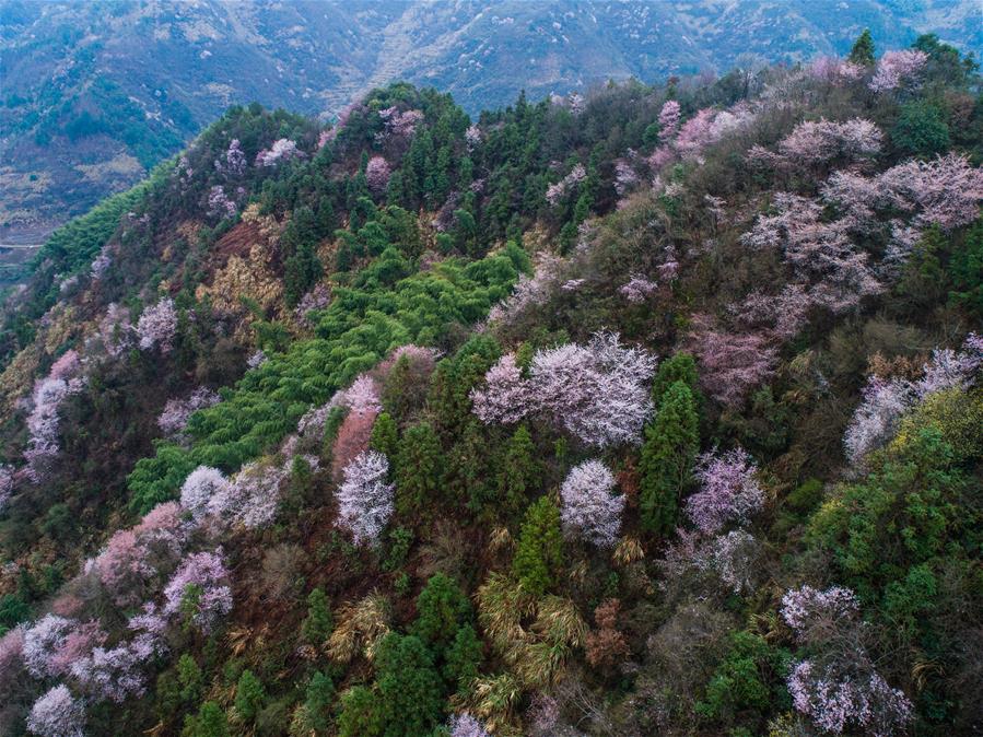 ZHEJIANG, 14 marzo, 2019 (Xinhua) -- Vista aérea de las flores de cerezo, en la villa de Wuxiang del municipio de Sandu en Jiande, provincia de Zhejiang, en el este de China, el 14 de marzo de 2019. (Xinhua/Xu Yu)