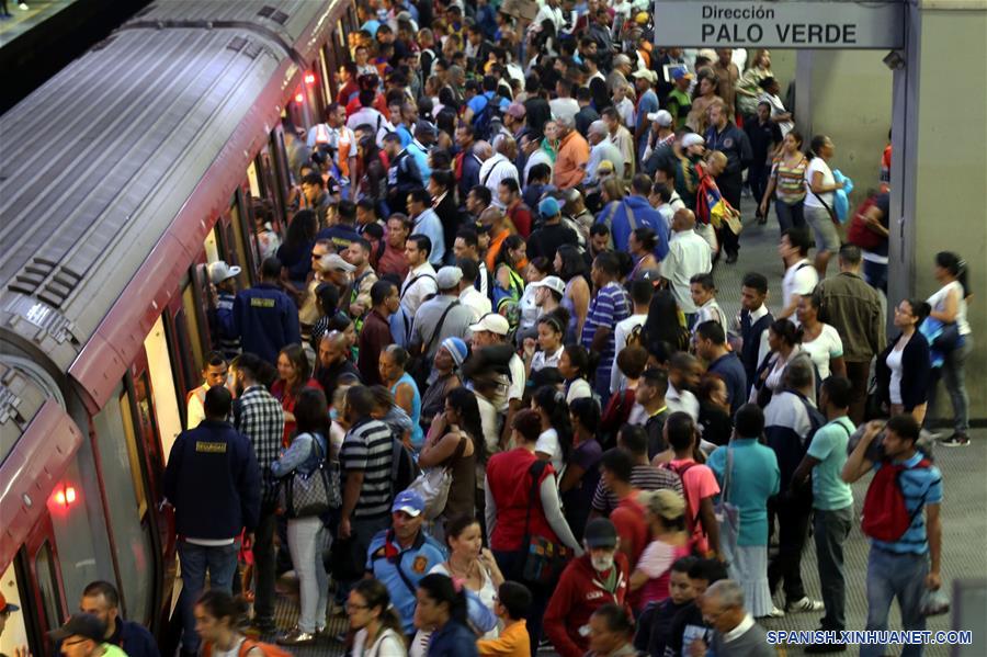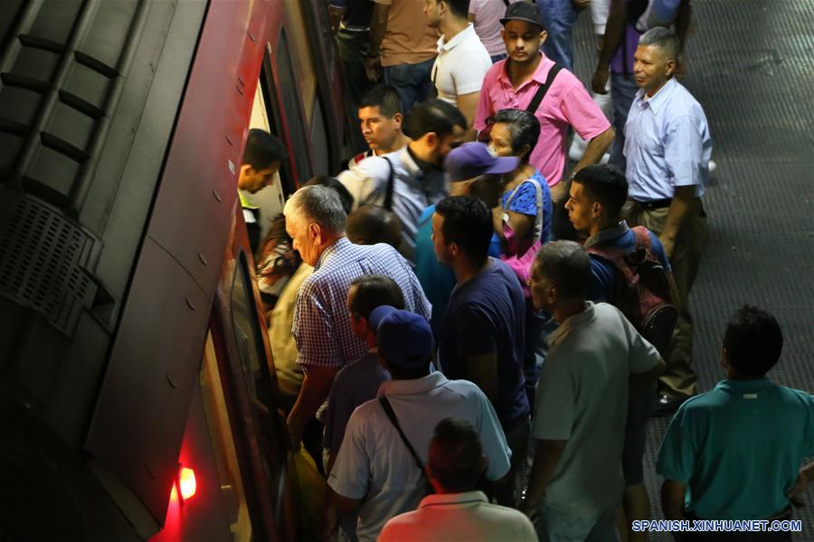Personas esperan para subir a un vagón del metro, en Caracas, Venezuela, el 14 de marzo de 2019. Venezuela reanudó este jueves actividades laborales tras la restitución de 100 por ciento del sistema eléctrico. (Xinhua/Str)