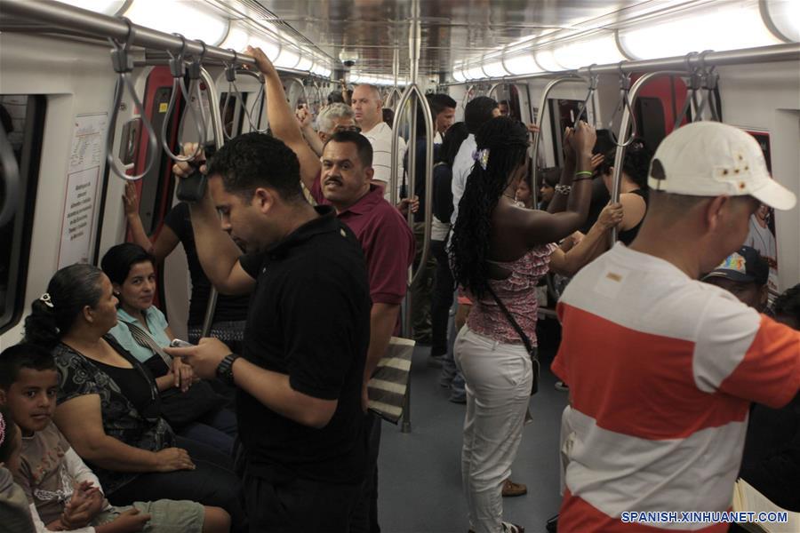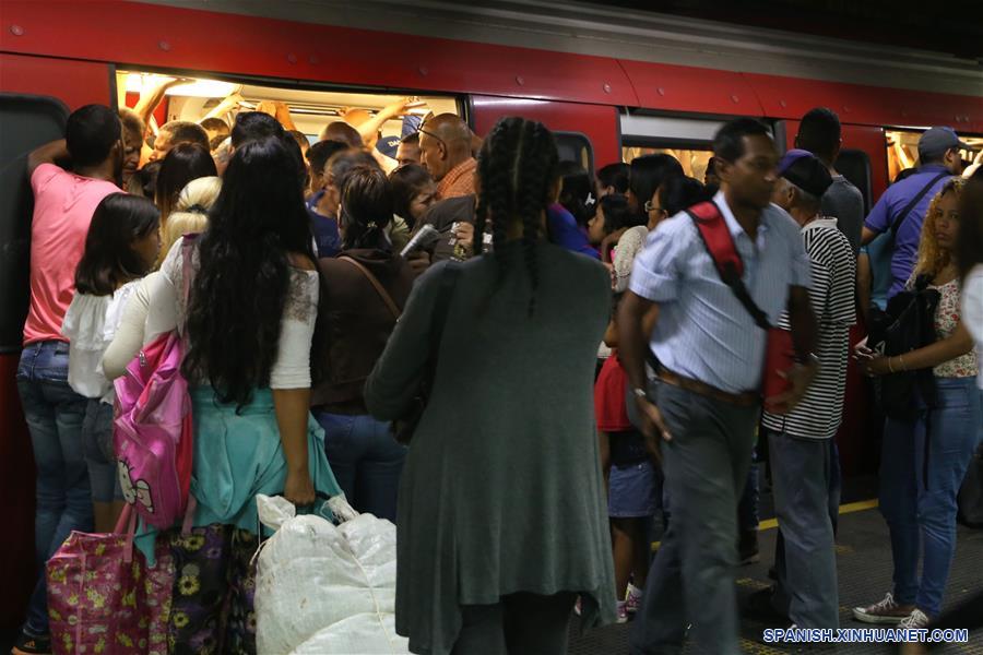 Personas viajan a bordo de un tren del metro, en Caracas, Venezuela, el 14 de marzo de 2019. Venezuela reanudó este jueves actividades laborales tras la restitución de 100 por ciento del sistema eléctrico. (Xinhua/Str)