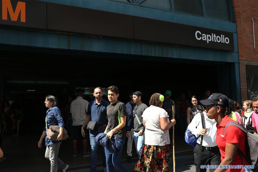 Personas caminan frente a la entrada de una estación del metro, en Caracas, Venezuela, el 14 de marzo de 2019. Venezuela reanudó este jueves actividades laborales tras la restitución de 100 por ciento del sistema eléctrico. (Xinhua/Str)