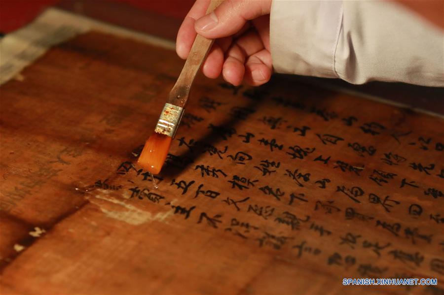 GUIZHOU, 18 marzo, 2019 (Xinhua) -- Un empleado del museo de los Escritos Jinping, elabora pegado de papel en un documento en el museo en el condado de Jinping, en la provincia de Guizhou, en el suroeste de China, el 18 de marzo de 2019. Remontándose a la dinastía Ming (1368-1644), los "Escritos Jinping" se refieren a los registros originales de contratos, libros de cuentas, informes del gobierno, genealogía y regulaciones del condado de Jinping y condados adyacentes que habitan los grupos étnicos Miao y Dong en la provincia de Guizhou. Los Escritos Jinping fueron catalogados como documentos de patrimonio por la Administración de Archivos Estatales en el a?o 2010. De los más de 60.000 documentos que se conservan, más de 40.000 piezas han sido restauradas y digitalizadas en el museo, en el que Wang y sus compa?eros de trabajo han hecho grandes esfuerzos en el trabajo de protección de los documentos antiguos. Por lo tanto han ganado una reputación como los guardianes de los Escritos Jinping. Una regulación a nivel de prefectura para la protección de los Escritos Jinping se ha establecido como una garantía legal para proteger los documentos desde el 1 de marzo de 2019. (Xinhua/Ou Dongqu)