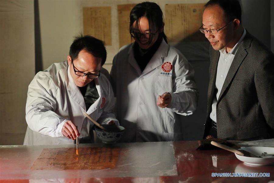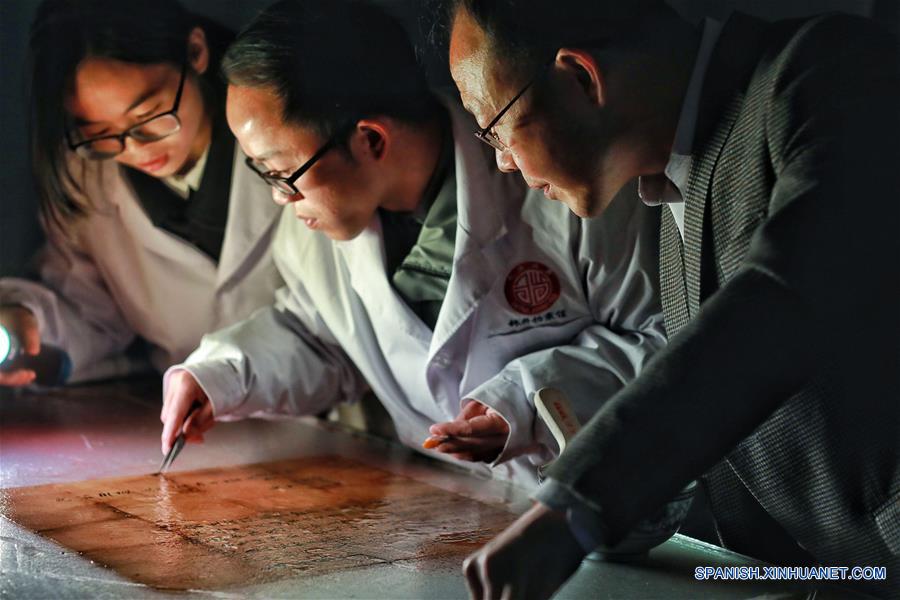 GUIZHOU, 18 marzo, 2019 (Xinhua) -- Wang Zongxun (d), curador del museo de los Escritos Jinping, observa mientras sus compa?eros realizan pegado de papel en un documento en el museo en el condado de Jinping, en la provincia de Guizhou, en el suroeste de China, el 18 de marzo de 2019. Remontándose a la dinastía Ming (1368-1644), los "Escritos Jinping" se refieren a los registros originales de contratos, libros de cuentas, informes del gobierno, genealogía y regulaciones del condado de Jinping y condados adyacentes que habitan los grupos étnicos Miao y Dong en la provincia de Guizhou. Los Escritos Jinping fueron catalogados como documentos de patrimonio por la Administración de Archivos Estatales en el a?o 2010. De los más de 60.000 documentos que se conservan, más de 40.000 piezas han sido restauradas y digitalizadas en el museo, en el que Wang y sus compa?eros de trabajo han hecho grandes esfuerzos en el trabajo de protección de los documentos antiguos. Por lo tanto han ganado una reputación como los guardianes de los Escritos Jinping. Una regulación a nivel de prefectura para la protección de los Escritos Jinping se ha establecido como una garantía legal para proteger los documentos desde el 1 de marzo de 2019. (Xinhua/Ou Dongqu)