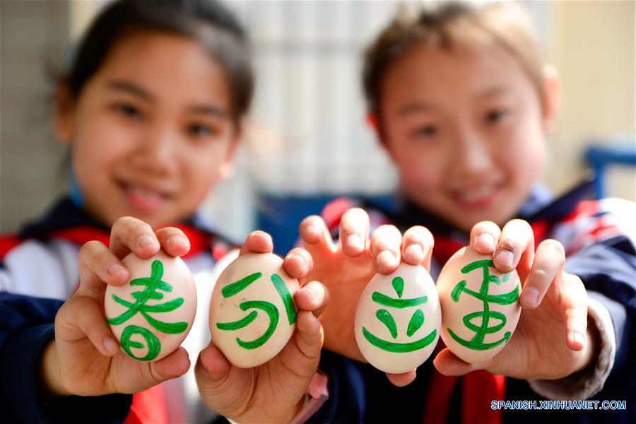 HEBEI, 20 marzo, 2019 (Xinhua) -- Estudiantes participan en un juego para hacer que los huevos se paren en posición vertical en una escuela primaria un día previo al "Chunfen", en Handan, provincia de Hebei, en el norte de China, el 20 de marzo de 2019. "Chunfen", que significa literalmente Equinoccio de Primavera o Equinoccio Vernal, es cuando el sol se encuentra exactamente en la latitud celeste de cero grados. (Xinhua/Wang Xiao)