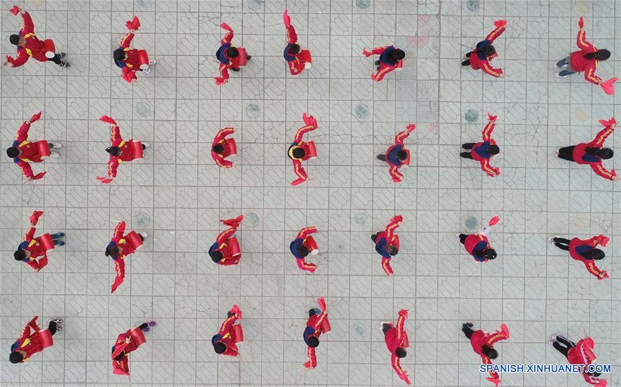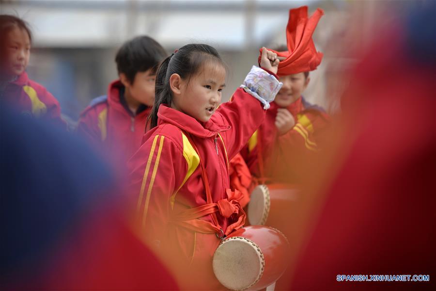 HEBEI, 20 marzo, 2019 (Xinhua) -- Estudiantes practican la danza del tambor de cintura en la Escuela Primaria Baiquan, en la Zona de Desarrollo Económico de Xingtai, en Xingtai, provincia de Hebei, en el norte de China, el 20 de marzo de 2019. (Xinhua/Zhu Xudong)
