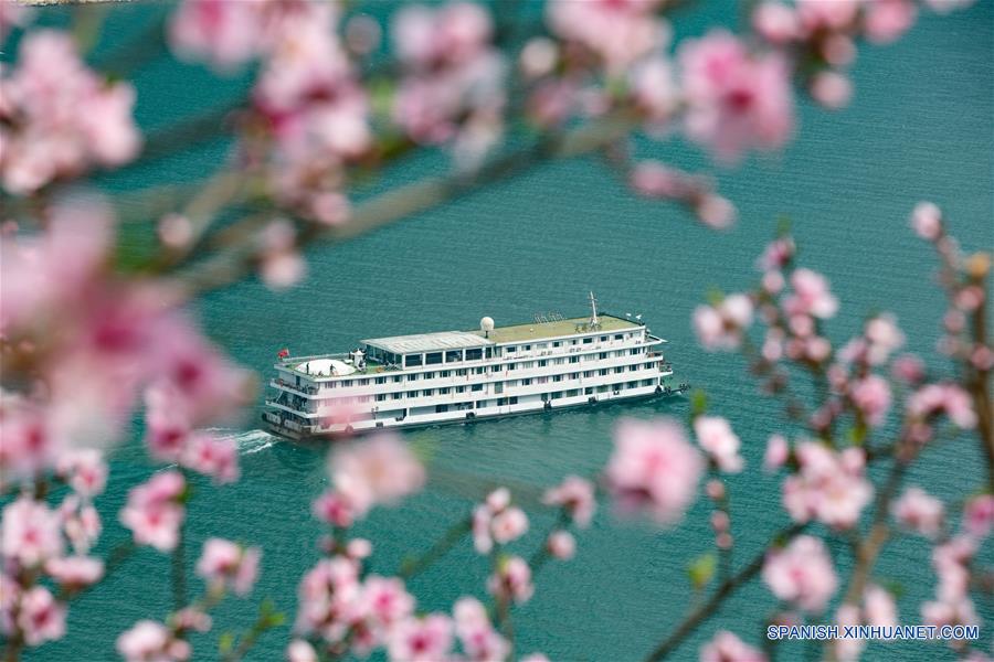 HUBEI, 20 marzo, 2019 (Xinhua) -- Imagen del 19 de marzo de 2019 de un bote navegando en la Garganta de Xiling, una de las Tres Gargantas a lo largo del Río Yangtze, en el condado de Zigui de Yichang, provincia de Hubei, en el centro de China. Las flores de los árboles de durazno florecen en la Garganta de Xiling a lo largo del Río Yangtze. (Xinhua/Lei Yong)