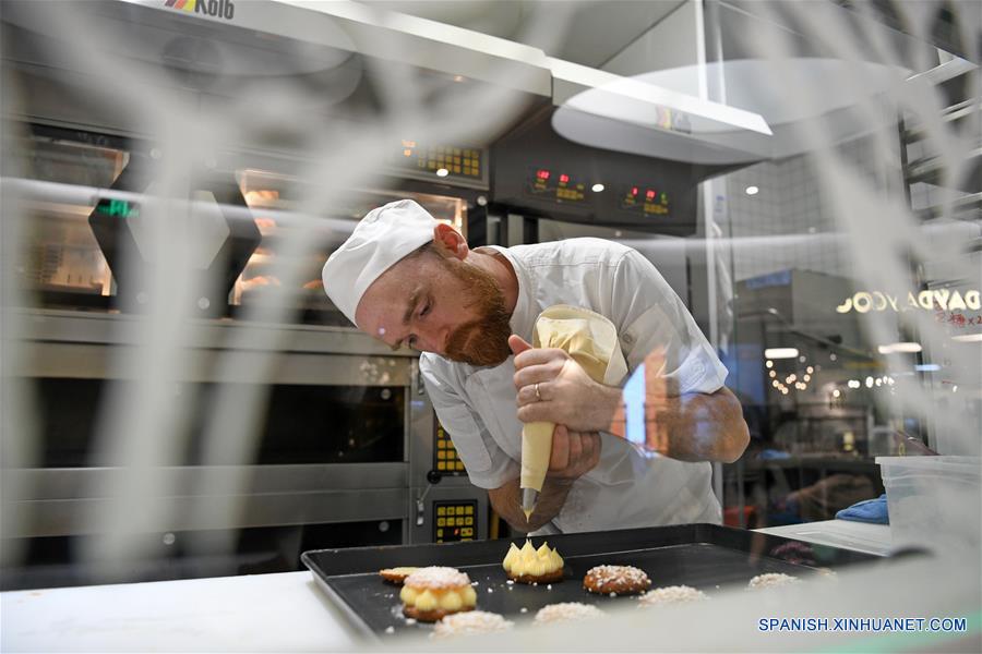 Imagen del 21 de marzo de 2019 del panadero francés Christophe elaborando postres en su panadería, en Guangzhou, provincia de Guangdong, en el sur de China. El panadero francés Christophe y su esposa Agnes fundaron su primera panadería francesa llamada "Perma" en 2012 y la segunda un a?o después en Guangzhou. Para satisfacer a los residentes de Guangzhou, Christophe elabora el pan con la integración de los sabores de la panadería francesa y la cultura gastronómica local. A medida que Francia se convierte en un destino turístico cada vez más popular para los jóvenes chinos, la pareja está más dedicada a la elaboración del pan de alta calidad para atender a los clientes chinos. (Xinhua/Liang Xu)