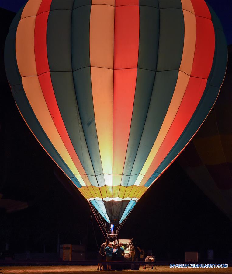 Personas iluminan un globo aerostático durante el evento nocturno del Festival del Globo Aerostático, en Hamilton, Nueva Zelanda, el 23 de marzo de 2019. El Festival del Globo Aerostático concluyó el sábado. (Xinhua/Guo Lei)