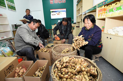 Aldeanos envasan jengibre fresco y arroz orgánico en un Centro de Servicio de Comercio Electrónico de la aldea Tuling, en Hongtang, Yichun, provincia de Jiangxi. 9 de noviembre del 2018. (Foto: Pueblo en Línea)