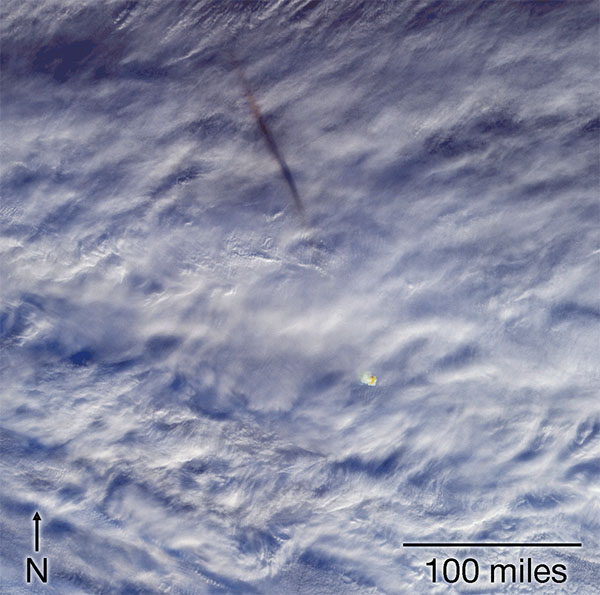 La imagen fija, capturada por el instrumento MODIS es una fotografía en color verdadero que muestra los restos del paso del meteorito, visto como una sombra oscura proyectada sobre nubes gruesas y blancas. MODIS capturó la imagen a las 23.50 UTC.