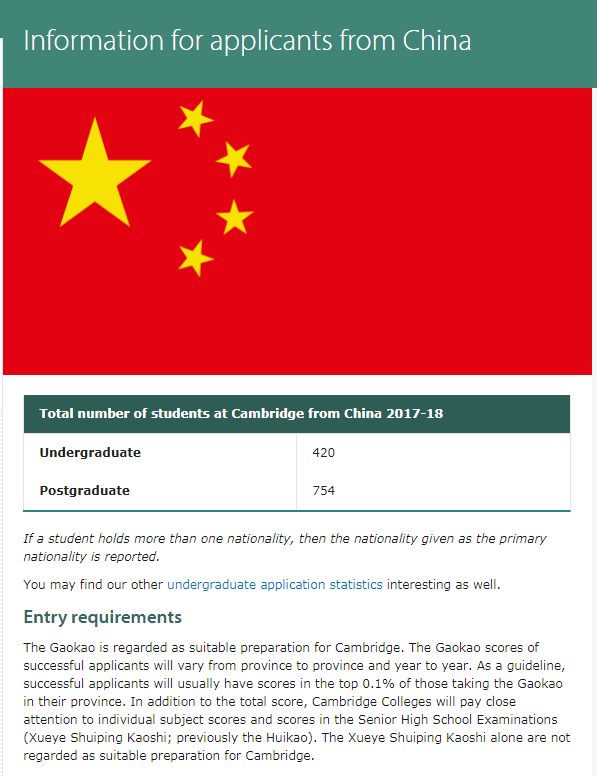 "El Gaokao es considerado como una preparación adecuada para estudiar en Cambridge. Las puntuaciones de solicitantes que pasan con éxito el Gaokao varian de provincia a provincia, y de a?o en a?o. Como línea general, los solicitantes que han pasado el Gaokao exhiben puntuaciones que los ubica dentro del selecto grupo del top 0,1 por ciento de los que realizan el Gaokao en su provincia natal. Además de la puntuación total, los colegios de Cambridge prestarán mucha atención a las puntuaciones individuales y a las puntuaciones en los exámenes superiores de la escuela secundaria (Xueye Shuiping Kaoshi; anteriormente conocido como Huikao). El Xueye Shuiping Kaoshi por sí solo no se considera como una preparación adecuada para matricular en Cambridge.