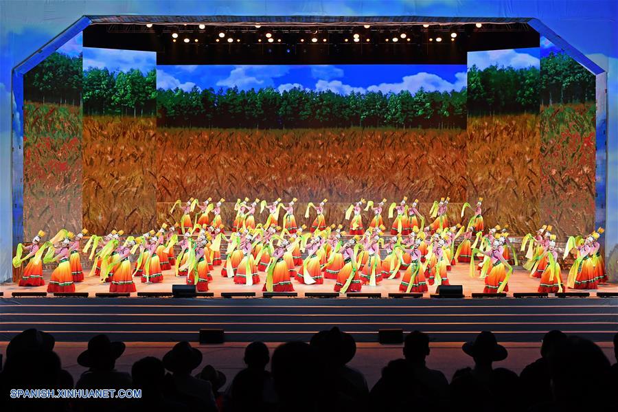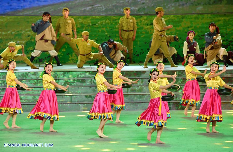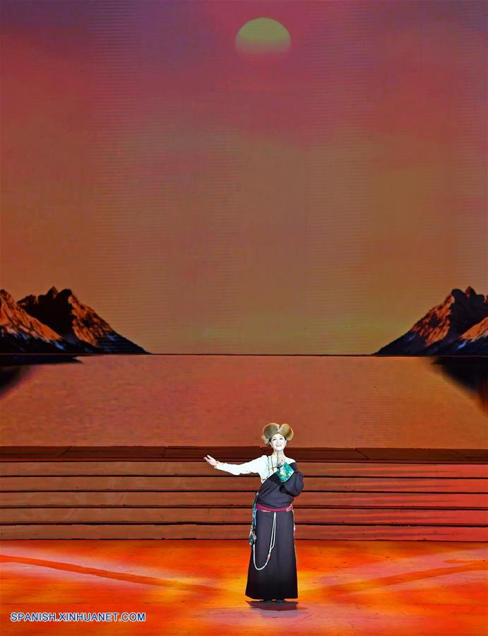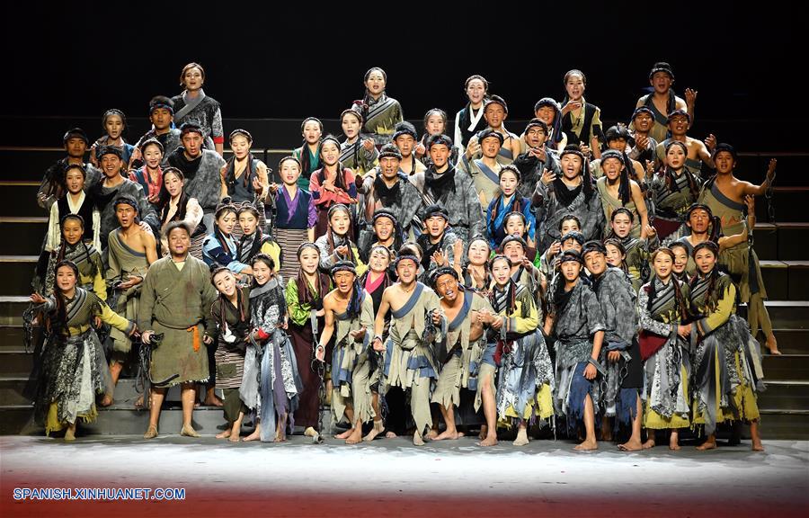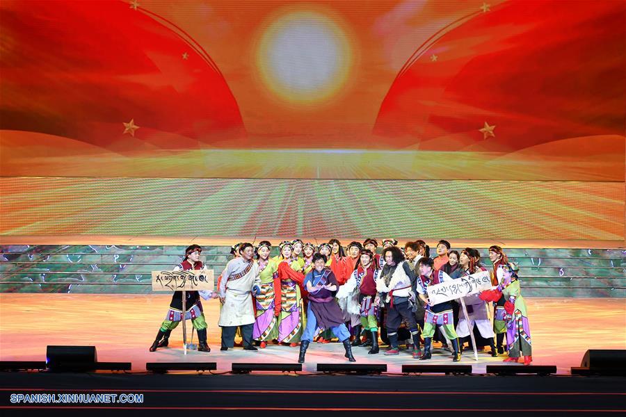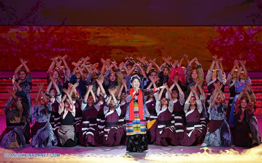 Artistas realizan una actuación durante una gala llevada a cabo en celebración por el 60 aniversario de la campa?a de la reforma democrática en el Tíbet, en Lhasa, capital de la región autónoma del Tíbet, en el suroeste de China, el 28 de marzo de 2019. (Xinhua/Li Xin)