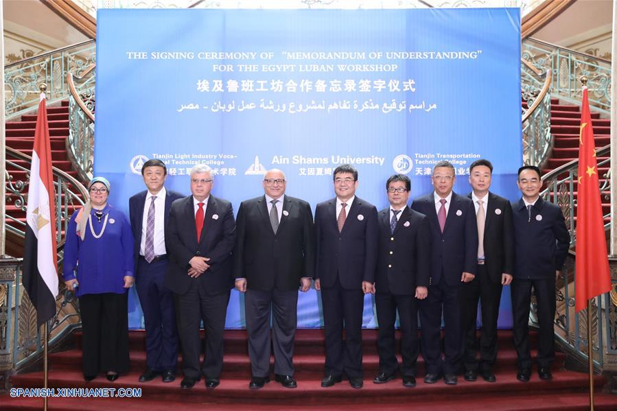 Personas participan en la ceremonia de firma de un Memorando de Entendimiento (MoU, por sus siglas en inglés) para el Taller Luban de Egipto, en El Cairo, Egipto, el 31 de marzo de 2019. De acuerdo con información de la prensa local, la Escuela Técnica Profesional de Industria Ligera de Tianjin, de China, la Escuela Profesional de Transporte de Tianjin y la Universidad Ain Shams, de Egipto, firmaron el domingo un Memorando de Entendimiento (MoU) para el Taller Luban de Egipto en El Cairo. (Xinhua/Li Binian)