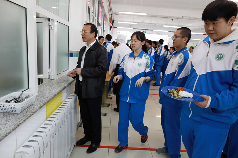 Liu Guoxiong, director de la escuela secundaria afiliada a UIBE, hace fila para almorzar en el comedor del recinto educativo. A partir del primero de abril entró en vigor un nuevo reglamento que obliga a los funcionarios de los jardines de la infancia, escuelas primarias y secundarias a almorzar junto a sus estudiantes. China, 1 de abril del 2019. [Foto: Zhu Xingxin/ China Daily]