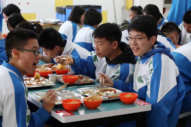 Los estudiantes de la escuela secundaria afiliada a UIBE almuerzan en el comedor. A partir del primero de abril entró en vigor un nuevo reglamento que obliga a los funcionarios de los jardines de la infancia, primarias y secundarias a almorzar junto a sus estudiantes. China, 1 de abril del 2019. [Foto: Zhu Xingxin/ China Daily]