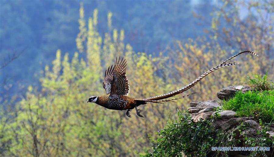 HUBEI, 1 abril, 2019 (Xinhua) -- Imagen del 28 de marzo de 2019 de un faisán venerado (syrmaticus reevesii) volando sobre la ladera de una monta?a en Guangshui, en la provincia de Hubei, en el centro de China. El faisán venerado, un ave endémica de China, es una especie inscrita en la lista de clase II de especies protegidas del país. (Xinhua/Mei Yongcun)